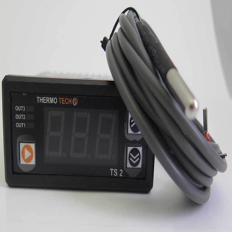 ترموستات دما TS2 یک ترموستات دیجیتال از برند ترموتک است که برای کنترل دمای یخچال، فریزر، دستگاه های یخساز و تجهیزات گرمایشی و سرمایشی استفاده میشود. محدوده دمایی این ترموستات 50- تا 150+ است. ترموستات دما TS2 دارای یکسال گارانتی تعویض،خروجی رله و همچنین خروجی SSR است که دارای قابلیت دو کنتاکت قطع و وصل می باشد. همچنین این ترموستات دارای یک نمایشگر دیجیتال سه رقمی با قابلیت نمایش دمای 0/1 درجه است.